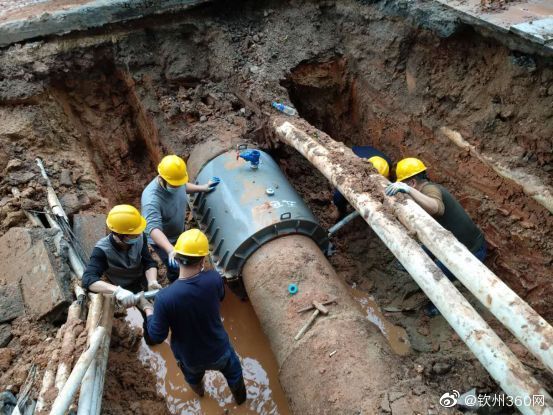 欽州市一DN600管爆裂,緊急想修12小時。3月2日凌晨6時,水務公司調度中心接到市民電話反映附小門地面大量漏水。經核查位于永福西大街欽師附小門口DN600管爆裂,我公司及時調整水廠出水水壓、關閉閥門并安排搶修隊員和設備進行搶修。在搶修過程中發現燃氣管道、弱電管線與排水管線距離供水管網過近,現場環境復雜,機械無法進行深度挖掘,在表皮挖掘后只能靠人力挖掘,搶修難度較大,為第一時間恢復通水,采取了“快速搶修節+哈夫節”的方案進行搶修。搶修隊員在挖掘機破開路面后下到坑內進行搶修,終于在當天18時完成搶修任務并恢復供水。