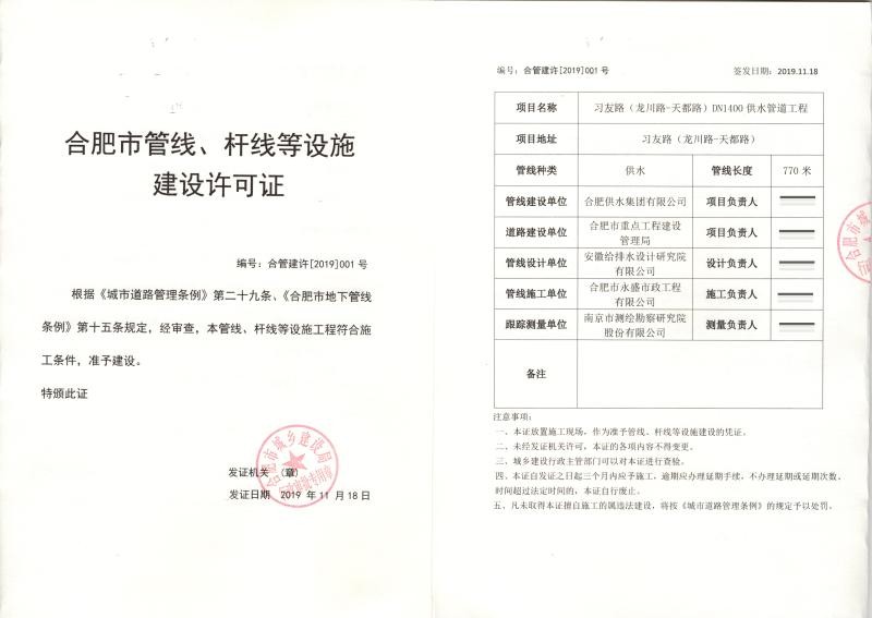2019年11月18日,隨著合肥市工程建設(shè)項(xiàng)目網(wǎng)上審批流程的完成,首張《合肥市管線、桿線等設(shè)施建設(shè)許可證》正式核發(fā),標(biāo)志著合肥市地下管線建設(shè)從此邁入規(guī)范、科學(xué)、有序建設(shè)的新時期。…