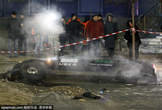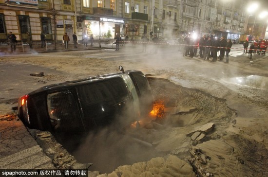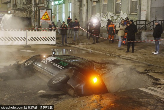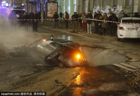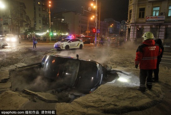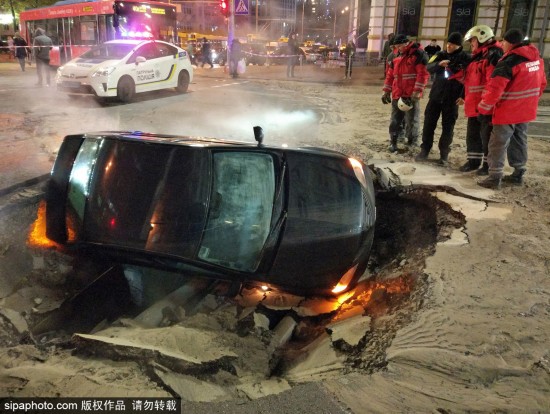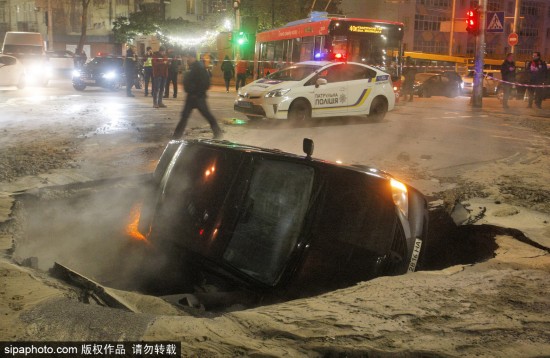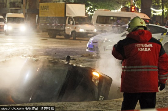 當地時間2018年11月13日,烏克蘭基輔,一輛車掉進了地面塌陷所造的深溝里。該事故發生在烏克蘭基輔市中心路段,供暖水管破裂導致路面出現塌陷情況,從而使得交通更加擁擠,對出行造成了很大的影響。(圖源:希帕中國)