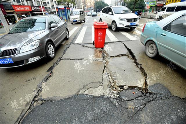 15日上午,楚天都市報記者在卓刀泉南路和機場二路交會處路口現場看到,塌陷點正好位于該路口斑馬線旁的路中央,一段長約6米、寬約2米的水泥路面從中間向下輕微塌陷,最深處約20厘米。塌陷點前方被人放置了一個垃圾桶,提醒過往車輛避讓。