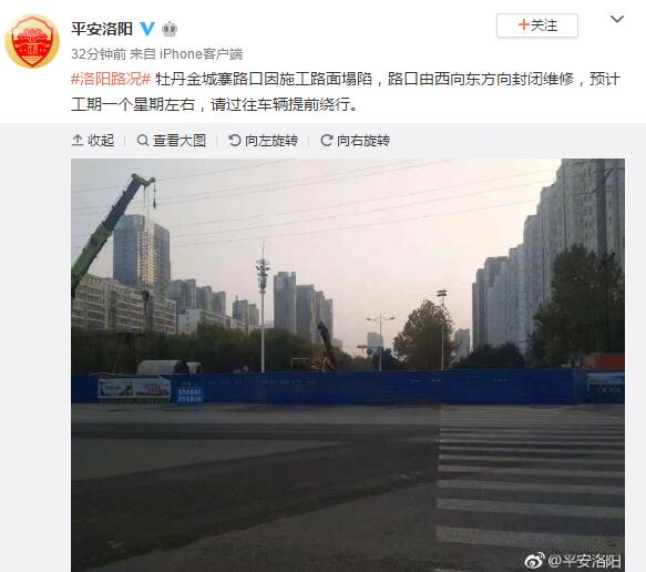 牡丹金城寨路口因施工路面塌陷,路口由西向東方向封閉維修,預計工期一個星期左右,請過往車輛提前繞行。