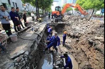 事發(fā)不久,紹興市水務產業(yè)有限公司立即派來三四十名工作人員,趕到現場處置。經過初步判斷,事發(fā)原因為富民橋東側一根直徑600毫米粗的供水主干管破裂。搶險人員隨即將管道閥門關閉,清理路面植被后臨時移走了該處的樹木,以免影響挖掘機操作,耽誤供水管道搶修。