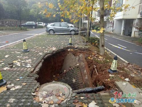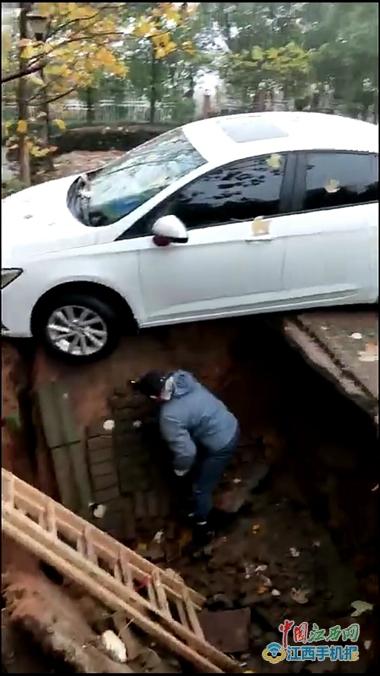 中國江西網(wǎng)訊 記者袁利攝影報道: 12月3日中午,有網(wǎng)友向中國江西網(wǎng)九江分站反映,濂溪區(qū)匡廬苑小區(qū)地面發(fā)生塌陷,一輛停在上面的小轎車因為地面突然塌陷失去重心,前輪懸空,險些掉落坑內(nèi)。