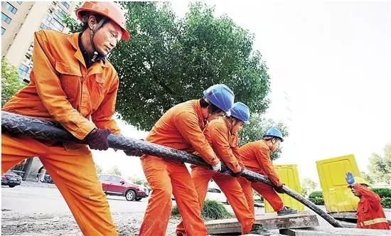 近日在市區旭陽路上,電力工人正在緊鑼密鼓地對電纜進行敷設(如圖),這是市區環境綜合整治暨城市精細化管理電網“上改下”工程的一個縮影。