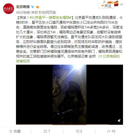 【突發!#北京昌平一路面發生塌陷#】北京昌平交通支隊剛剛通報,17日晚6時許,昌平區東小口鎮天通苑中東路東小口派出所向西約70米左右,道路南側路面發生塌陷,目前塌陷面積在1米多寬2米多長,深度淺處幾十厘米,深處將近1米,塌陷周邊還有懸空現象,但暫時沒有繼續擴大的跡象,塌陷原因暫無法確定。昌平交通支隊回龍觀大隊接到報警后,立即呼叫路面執勤警力趕到現場,對現場及時采取防護措施,擺放錐桶并進行安全疏導。請過往車輛駕駛員注意提前減速,依序通過,注意安全。交管部門已將塌陷情況通報給市政有關部門,塌陷原因調查和相關的施工排險措施將很快展開。