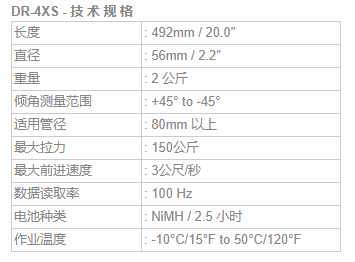 DR-4XS為多功能、高實用性的管道測繪系統(tǒng)。此系統(tǒng)可在不受區(qū)域及管道限制下,針對多種范圍管徑的管道進行檢測,并提供精準(zhǔn)的管道定位信息。