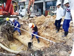 上午9時許,石碁自來水公司10多名搶修人員集中力量在城區大道52號爆水管位置開展搶修,移開爆水管位置的一輛面包車,用挖機開挖地面,用水泵抽坑洼里的水,將爆裂的水管取出來,換上新的水管。搶修人員表示,預計當天下午3時左右可以搶修完工,恢復供水。