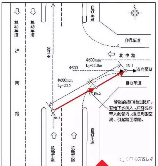由于管道有不均等沉降,管接口已被拉開,地下水從裂縫處大量流入,導(dǎo)致了上述的淤泥堆積和管道沉降。