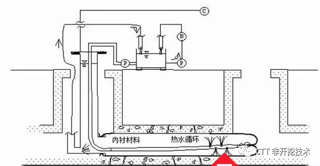 其主要施工原理為,根據(jù)現(xiàn)場的實際情況在工廠內(nèi)按設(shè)計制造內(nèi)襯軟管,然后灌浸熱硬化性樹脂制成樹脂軟管。施工時首先向舊管內(nèi)插入輔助內(nèi)襯管,然后利用翻轉(zhuǎn)法,將樹脂軟管和加熱用溫水輸送管翻轉(zhuǎn)插入輔助內(nèi)襯管內(nèi)。翻轉(zhuǎn)完成之后,利用水壓使樹脂軟管膨脹并緊貼在舊管內(nèi),然后利用循環(huán)的方式通過溫水循環(huán)加熱。在規(guī)定的設(shè)計時間內(nèi),使具有熱硬化性的樹脂軟管硬化成型,舊管內(nèi)即形成一層高強度的內(nèi)襯新管。圖-2為施工示意圖。