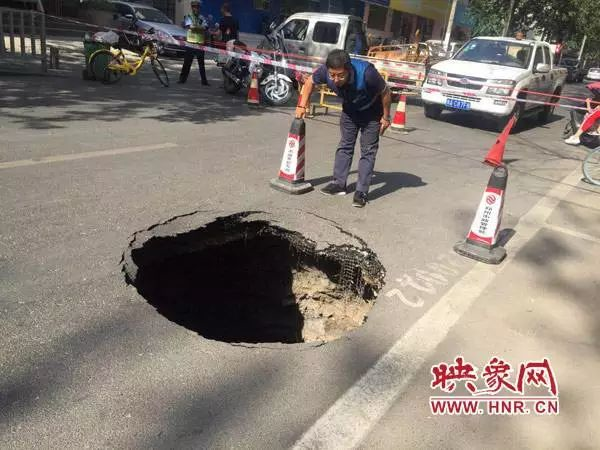 在現場采訪中,當搶修人員剛將一層回填的泥土夯實后,一個電話打到了穆林的手機上。據電話的另一端稱,在鄭州市淮河路與華山路交叉口向西約300米路南的人行道上,道路突發塌陷,起因是現場附近某管線單位雨水管道過路套管發生泄漏,雨水沖刷路基導致水土流失所致。接到該線索后,穆林立即與相關單位和搶修人員溝通,對塌陷道路進行警戒封閉,并安排相關搶修事宜。