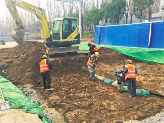 當進入施工圍擋內,一臺挖掘機正在工作,道路中間約有40平方米的路面已被破開,幾名搶修工人在配合挖掘機對開挖路段進行一層層的壓實回填。因搶修現場地下不僅有已修復的雨水管道,還有正在施工的燃氣頂管(頂管:一種不開挖或者少開挖的管道埋設施工技術),所以搶修人員與機械都是非常小心地進行施工。搶修中,每當施工進入新的工作階段,如地基一層層的回填碾壓等,穆林和李豐軍就會立即做出要求指令。由于現場施工器械必須由專業搶修人員操作,采訪過程中,記者也沒能幫上什么忙,只能在坑邊整理搶修圖紙。