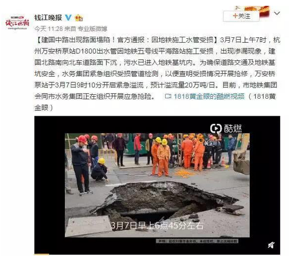 具體內容:3月7日上午7時,杭州萬安橋泵站D1800出水管因地鐵五號線平海路站施工受損,出現滲漏現象,建國北路南向北車道路面下沉,污水已進入地鐵基坑內。為確保道路交通及地鐵基坑安全,水務集團緊急組織受損管道檢測,以便查明受損情況開展搶修,萬安橋泵站于3月7日9時10分開啟緊急溢流,預計溢流量20萬噸/日。目前,市地鐵集團會同市水務集團正在組織開展應急搶險。