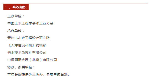 本次會議將邀請中國土木工程學(xué)會水工業(yè)分會領(lǐng)導(dǎo)、中國城市規(guī)劃協(xié)會地下管線專業(yè)委員會領(lǐng)導(dǎo)、天津市行業(yè)主管部門領(lǐng)導(dǎo)以及中國工程院院士、國內(nèi)外知名專家、學(xué)者。歡迎全國給水排水行業(yè)科研、建設(shè)、設(shè)計、施工、運營等單位的同行積極參會交流。