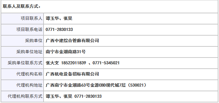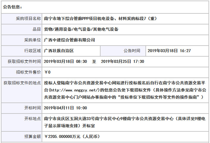 廣西機電設備招標有限公司受廣西中建綜合管廊有限公司委托,根據《中華人民共和國政府采購法》等有關規定,現對南寧市地下綜合管廊PPP項目機電設備、材料采購標段7(重)進行公開招標,歡迎合格的供應商前來投標。