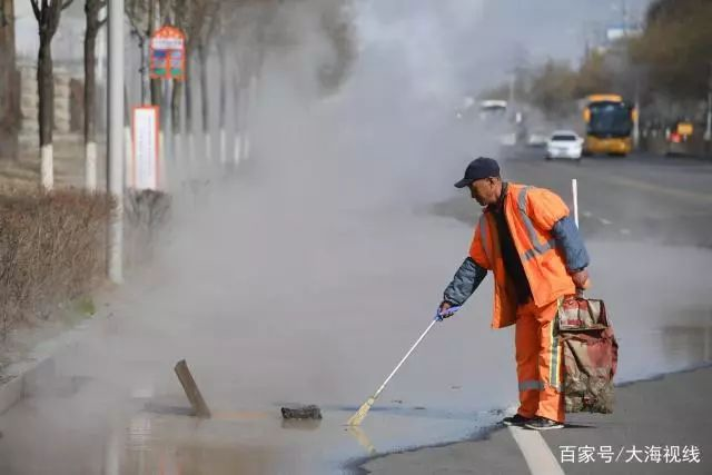 不斷涌出的熱水占去了兩排機動車道和一排非機動車道。熱水產生的熱氣更是擋住了行人與駕駛人的視線。