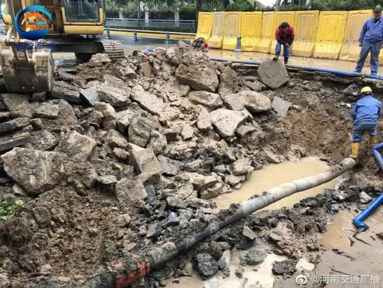 現場,路面快車道被挖開二三十平方,最深處約三米。搶修人員介紹,26號凌晨0點30分,該處一根自來水管道爆裂,路基受到沖刷出現塌陷。搶修人員趕到現場后,實施道路圍擋進行搶修。因占壓道路較多,對九如東路從商務外環路到黃河南路一段采取了臨時管制,禁止機動車通行。預計27日晚上前搶修完畢,后期還要進行路面回填恢復等工作。在此期間,該路段處于臨時封閉圍擋狀態,請市民合理規劃路線。因搶修需要,周邊有2個供水閥門被關閉,影響到鄭州47中高中部,鄭州市鄭東新區外國語學校用水,由自來水公司協調做好校園用水保障。