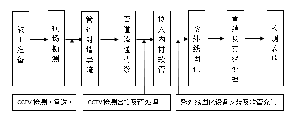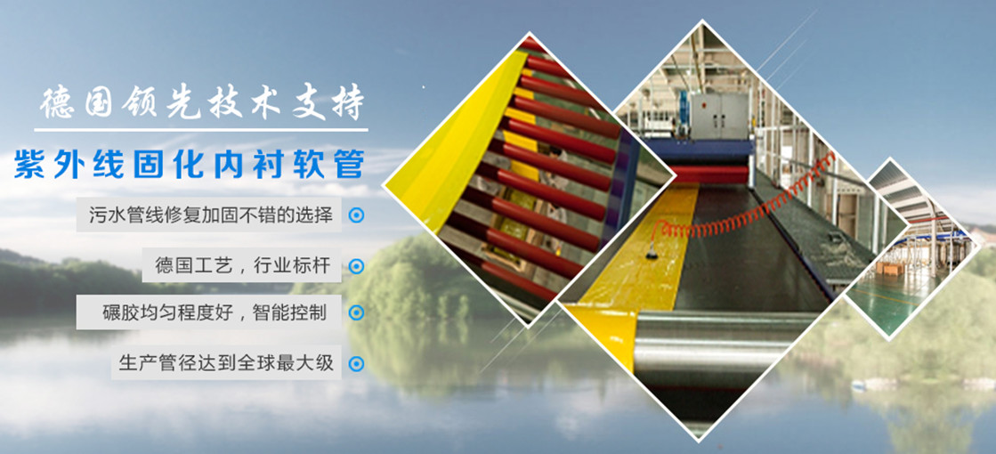 目前,非開挖修復技術有很多種,其中紫外光固化修復技術(UV-CIPP)是目前國際上使用最多的管道修復技術之一,屬于原位固化法(CIPP)中的一種,采用機械牽引將浸滿感光性樹脂的玻纖軟管拖入被修復的管道,灌注壓縮空氣使其緊貼管道內壁,通過紫外光燈照射使樹脂在管道內部固化,形成高強度內襯樹脂新管,使管網排水功能和安全性能不再受到原病害的影響。