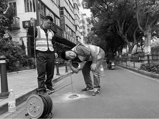 “找到了!”全繁榮用噴繪瓶畫了一個紅圈。由于地下管線復(fù)雜,在鉆聽洞之前,全繁榮先仔細(xì)觀察路邊的管線標(biāo)志,再鉆洞。兩分鐘后,一個約一根手指粗的聽洞就出來了。接下來,全繁榮拿出一根長約150厘米、直徑約0.8厘米的鋼柱,頂端有圓盤狀聽筒,這是聽漏師的秘密武器,叫聽音桿。將聽音桿插入聽洞里,進(jìn)行聽聲。為了更好地確定聲音,全繁榮換了好幾個姿勢,從彎腰曲背到蹲在地面再到趴在地面,終于確定了漏水點。