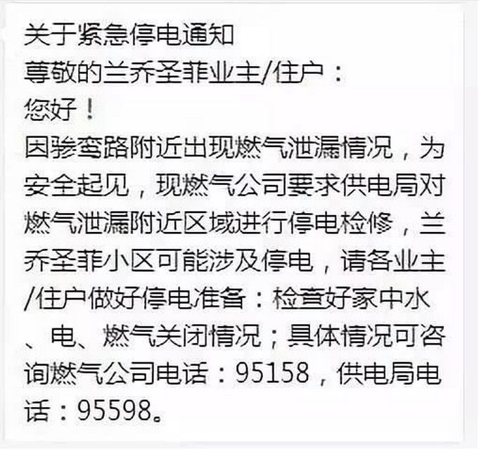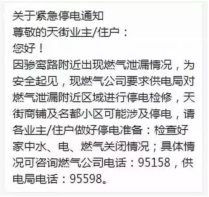 為確保施工安全,供電部門已對天然氣泄漏附近區(qū)域進行停電檢修,驂鸞路附近的如蘭喬圣菲、天街等多個小區(qū)及商圈均及時向業(yè)主發(fā)布緊急停電通知。附近都多個小區(qū)及商圈物業(yè)發(fā)布了相關(guān)緊急通知。