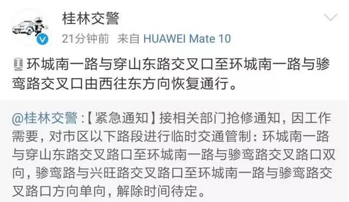 接相關(guān)部門搶修通知,因工作需要,對桂林市區(qū)以下路段進行臨時交通管制:環(huán)城南一路與穿山東路交叉路口至環(huán)城南一路與驂鸞路交叉路口雙向,驂鸞路與興旺路交叉路口至環(huán)城南一路與驂鸞路交叉路口方向單向,解除時間待定。