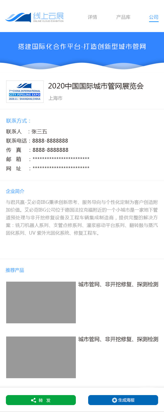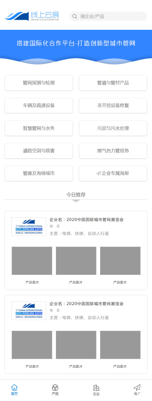 “線上云展”——設置管網探測與檢測、管道與管材產品、車輛及疏通設備、非開挖設備修復、智慧管網與水務、污泥與污水處理、道路空洞與病害、燃氣熱力管應急、管廊及海綿城市及企業專屬海報等版塊,實現零距離展示、溝通,做到無障礙、無時差營銷;根據企業產品特點,精準匹配市場需求、挖掘新客戶,為企業搭建良好的供求貿易平臺,在全球市場上贏得商機、提高效益。