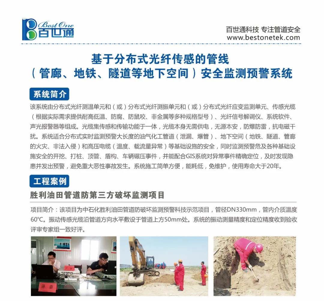 百世通擁有自主軟件著作權(quán)的“基礎(chǔ)設(shè)置安全健康智能綜合監(jiān)測預(yù)警平臺”和18項跟管線安全相關(guān)的專利授權(quán),致力于以埋地管道、線纜為主的基礎(chǔ)設(shè)施安全監(jiān)測技術(shù)研究、推廣,提供安全健康監(jiān)測產(chǎn)品和安全評估服務(wù)。針對新建管道,公司提供基于分布式光纖傳感技術(shù)的管道泄漏監(jiān)測和爆管、第三方開挖破壞、地質(zhì)沉降、山體滑坡預(yù)警系統(tǒng);針對既有在線運行管道,公司提供基于準分布式光纖聲音偵聽技術(shù)的管道泄漏監(jiān)測和爆管、開挖破壞預(yù)警系統(tǒng)。為了杜絕漏報,公司開發(fā)了多種技術(shù)原理和性能的光傳感產(chǎn)品;為了提高報警準確率降低誤報,公司開發(fā)了模式識別算法軟件;為了給客戶提供專業(yè)建議,公司正在組建專家?guī)旌蛯<視\系統(tǒng)。