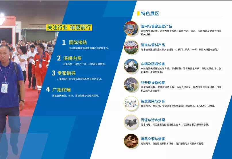 將全面展示管網建設、管網運行、智慧水務、污水污泥處理、管道材料、地下空間、在線運行監測、管網探測檢測、非開挖修復、微型非開挖掘進設備、新型市政機械設備、道路空洞與病害等行業領域最先進產品和技術,詮釋了行業的實力和魅力,吸引眾多業內人士的關注,助力管網行業的高速發展。
