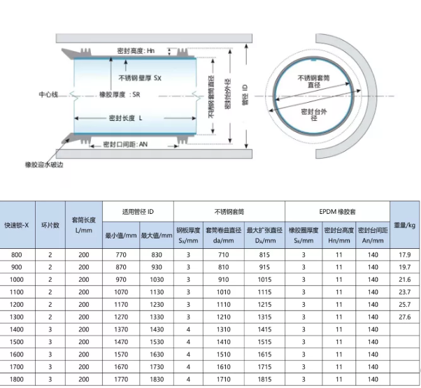 大直徑管道局部修復用快速鎖-X是由數控加工的高品質不銹鋼環片、專用鎖緊螺栓和 EPDM橡膠圈三部分組成,管道修復施工時,工人進入待修復管道部位,先將不銹鋼環片預拼裝成比管道內徑略小的套環,后將EPDM橡膠圈套在套環外面,然后將套環正確放置在擬修復部位并采用專用安裝工具將快速鎖套環撐開張緊,使套環及橡膠圈與管壁緊密、無縫貼合后將專用鎖緊螺栓鎖死,完成對管道的局部修復。