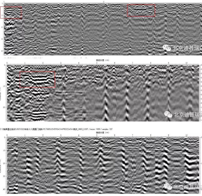 咱們同行們在地鐵管片探測中是否遇到過這么一個問題,因?yàn)楣芷摻蠲芏忍?00(500)MHz的天線分辨率太差,全是鋼筋的震蕩信號,看不到管片壁后的情況,而采用800(900)MHz的高些頻率的天線鋼筋是清楚了,也不震蕩了,但是他的測深卻又太小了,在穿透雙層鋼筋時(shí)能量已衰弱,只有少許能量能穿過管片到達(dá)壁后,甚至有時(shí)連管片都穿透不了,給我們檢測人員帶來極大苦惱。這時(shí)該怎么辦呢,是否可以采用中間頻率的天線進(jìn)行管片壁后脫空探測呢?
