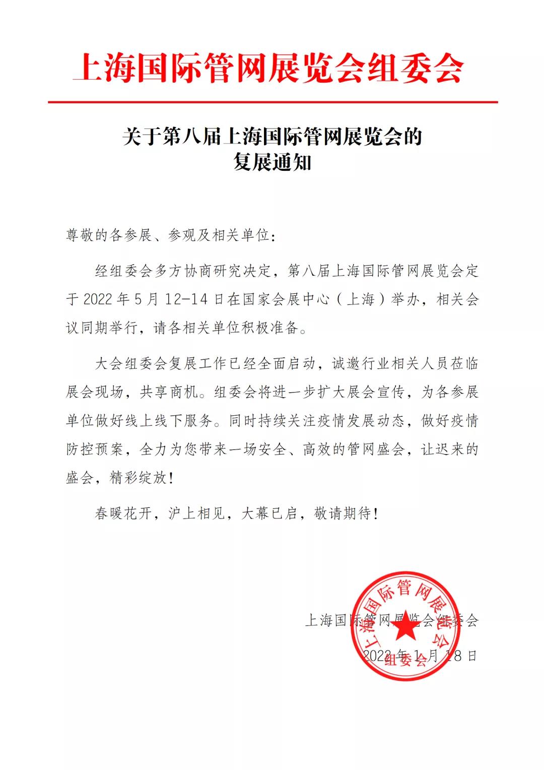 第八屆中國(guó)國(guó)際管網(wǎng)展將于2022年5月12日-14日舉辦,展示面積預(yù)計(jì)超過50000平米,將吸引展商600余家,專業(yè)觀眾預(yù)計(jì)超60000多人次。大會(huì)同期召開上海國(guó)際非開挖工程裝備展覽會(huì),同時(shí)將開展150余場(chǎng)高峰論壇、行業(yè)研討和新品發(fā)布會(huì)議,大會(huì)覆蓋管網(wǎng)建設(shè)、管網(wǎng)運(yùn)行、智慧水務(wù)、燃?xì)鉄崃Α⑽鬯勰嗵幚怼⒐艿啦牧稀⒌叵驴臻g、在線運(yùn)行監(jiān)測(cè)、管網(wǎng)探測(cè)檢測(cè)、非開挖修復(fù)、微型非開挖掘進(jìn)設(shè)備、新型市政機(jī)械設(shè)備等多個(gè)領(lǐng)域。誠(chéng)摯的邀請(qǐng)行業(yè)單位繼續(xù)參加本次大會(huì),通過展覽和論壇全面展示公司業(yè)務(wù),交流行業(yè)心得,共同建立政、產(chǎn)、學(xué)、研一站式管網(wǎng)技術(shù)交流平臺(tái)。