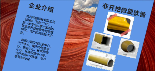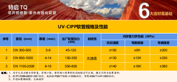 現已完成研發并并投入產業化生產的材料包括:①局部樹脂固化修復技術的點修樹脂、②CIPP內襯修復技術的紫外光軟管、③噴涂修復技術的噴涂特種灰漿、④管網滲漏預處理的堵漏注漿料、⑤軟襯修復技術的錨固墊及高性能復合灰漿。