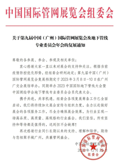 再次感謝行業同仁長期以來的支持、理解和陪伴,期待與您相聚羊城廣州,共襄管網盛會。