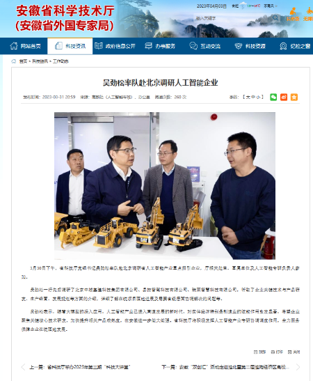 3月30日下午,安徽省科技廳黨組書記吳勁松率隊(duì)赴北京中城基建科技集團(tuán)有限公司進(jìn)行調(diào)研,省科技廳創(chuàng)新發(fā)展規(guī)劃處處長崔道成、省科技情報(bào)研究所所長楊恒宇、省科技廳人工智能專班工作組副組長吳銳、省科技廳辦公室三級主任科員劉超等領(lǐng)導(dǎo)參加;北京中城基建總經(jīng)理趙勝嶺率公司管理層及首席專家陪同會(huì)談交流,并匯報(bào)了“預(yù)防道路塌陷全產(chǎn)業(yè)鏈”的建設(shè),調(diào)研組一行對中城基建的技術(shù)創(chuàng)新給予了高度評價(jià)。