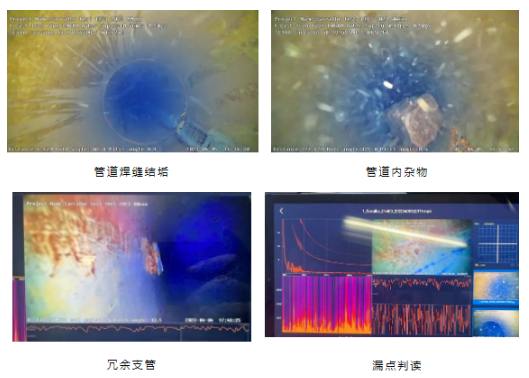 經全程檢測、分析與技術評估,發現該管段的內襯情況良好,無脫落現象,管道6.67米處焊縫輕微結垢;227.6米處發現一雜物占據管道截面1/4以上,嚴重影響管道通流能力;52米處發現管線圖未標注的冗余支管。本次檢測探測到3處漏點,并完成全段管線軌跡精準定位。