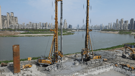 在武漢市江漢十橋項目施工現(xiàn)場,工作人員有序施工,工程機械運轉不停,三臺徐工旋挖鉆機正進行樁基礎施工,腳下不時傳來震動感。