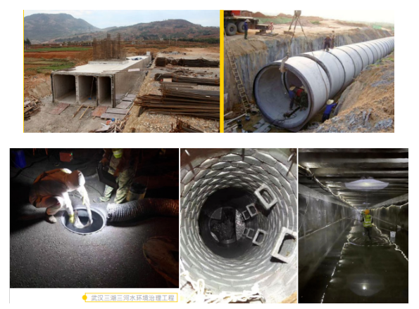 地下箱涵、排水井、大口徑管道、管廊、污水井池、污水管網(wǎng)設(shè)施,是建設(shè)在城市路面以下,用于集中排水等市政排水的公共污水管網(wǎng)。是城市運行的“生命線” 。受水文,地質(zhì),荷載等影響,投入使用后受力情況發(fā)生變化,容易引起管道箱涵變形,破損。由于箱涵主體部分長期處于地下潮濕的 壓力環(huán)境中,水分沿開裂縫隙和混凝土毛細管滲透到箱涵內(nèi)部,產(chǎn)生滲透積水的問題。若不及時排除,不僅會進一步侵蝕箱涵頂部及 墻體,還會對箱涵結(jié)構(gòu)造成損害。加上管道內(nèi)部積攢的污水長期發(fā)酵產(chǎn)生有害氣體,日積月累形成安 全隱患,甚至引發(fā)地面路面坍塌