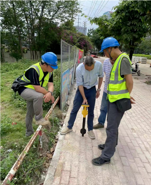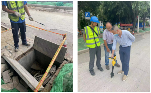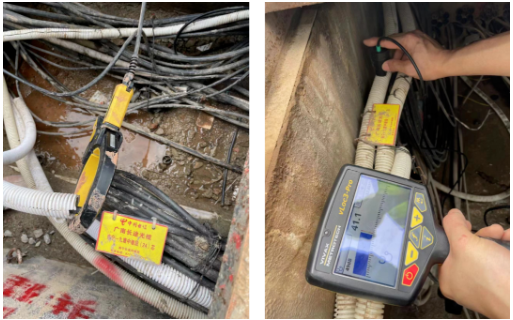 現場說明:該場景為市政施工現場,因為有開挖施工,故需要對光纜進行準確測試,給出準確的位置和深度信息,確保施工過程中不被損壞;因人井旁邊就是電力的井,存在信號串擾的復雜環境,故優先使用視蹤探頭,但發現管道不通,最終使用夾鉗法對光纜進行探測。
