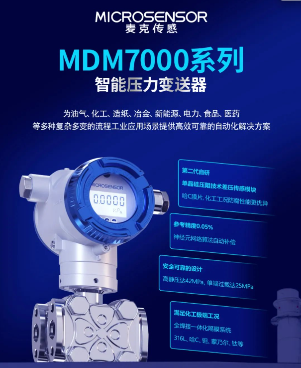 MDM7000系列智能壓力變送器有多種形態(tài)和模塊功能設(shè)計可選,具有多項(xiàng)資質(zhì)認(rèn)證。可廣泛適用于石油、化工、電力、冶金、新能源、食品飲料、醫(yī)藥、制漿造紙、環(huán)保水處理、船舶等各種復(fù)雜的流程工業(yè)領(lǐng)域應(yīng)用場景,為工業(yè)過程的自動化控制提供更加安全高效可靠的測量方案。
