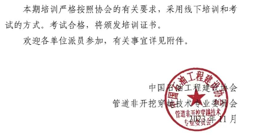 培訓后經考試合格,由中國石油工程建設協會管道非開挖穿越專業技術委員會頒發培訓合格證書,該證書可用于作為企業申請施工能力認證評價標準之一。