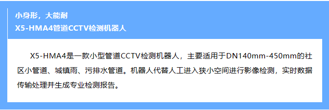 然而在實際檢測工作中,我們也會遇到一些“特殊情況”:小管徑檢測。目前,單元樓排污主管道口徑一般是150-300mm。基于這種特殊的工況,我們推薦一款適合小管徑管道檢測的X5-HMA4管道檢測機器人。X5-HMA4最小適用管徑為DN140mm,是小區小管徑管道的檢測能手。