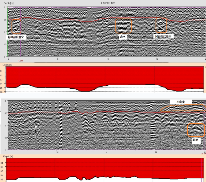 上圖為使用600MHz天線在某鐵路隧道探測及分析結果圖,圖中紅色線為二襯分層線,下面紅色圖為二襯厚度示意圖。橙色標注區域為病害區域,以及相對應的病害解釋。