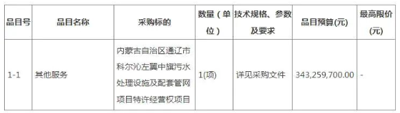 合同包1(內蒙古自治區通遼市科爾沁左翼中旗污水處理設施及配套管網項目特許經營權項目):