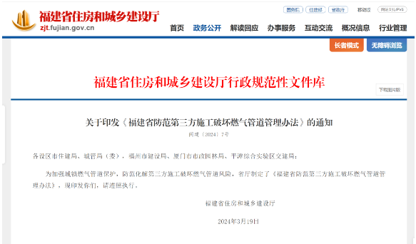 近日,福建省住房和城鄉建設廳發布關于印發《福建省防范第三方施工破壞燃氣管道管理辦法》的通知。