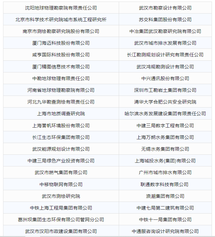 當地管網權屬、綜合管理單位、設計、研究、教育機構、綜合服務單位、勘察單位、工程服務單位、裝備制造、材料生產單位、軟件服務單位。
