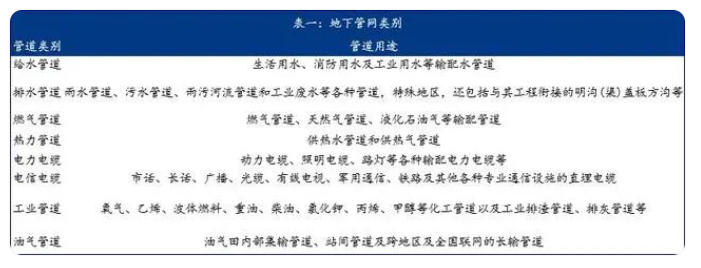 地下管網是埋設在地下管道的總稱,用途廣泛。作為一種用途廣泛的輸送裝置,管網廣泛應用于市政工程和各種工業裝置中,在國民經濟和國防建設中發揮著不可或缺的作用。按照管道的應用場景來劃分,市政管道主要包括供水管道、排水管道、燃氣管道、熱力管道以及電力、電信電纜等六大類,是城市建設的重要基礎設施。除市政管道以外,工業管道和油氣管道也是當前地下管線工程當中的重要組成部分。