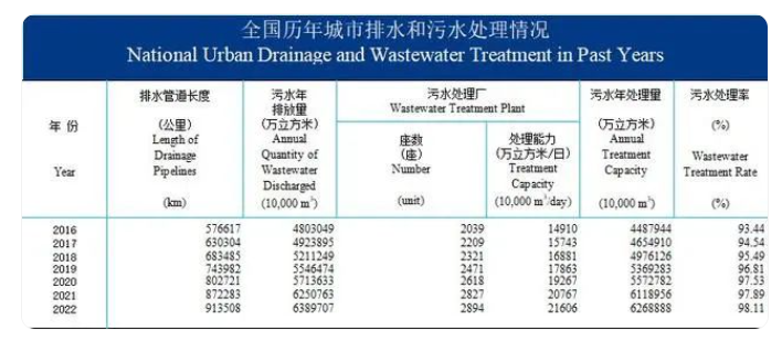 2016年,國內排水管網長度為57.66萬公里;2022年國內排水管網長度91.35萬公里。7年共增長33.69萬公里,增幅高達58.43%,年均增長管道長度約4.81萬公里,年均增幅8.35%。截至2022年城市供水管道長度排名,第一名為廣東省14萬公里,第二名為江蘇省9.4萬公里,第三名為山東省7.5萬公里。
