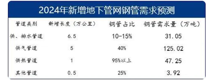 隨著工業化、城市化進程逐步進入高質量發展階段,我國城市地下空間的開發、利用從高速增長階段轉向高質量發展階段,增速比例有所放緩。地下管網年均增長超15萬公里轉向年均增長約10萬-12萬公里左右,增幅約為10%左右。新建管網方面,預計2024年市政管網的建設長度在12萬公里左右。總投資在3000億元-5000億元。鋼管占比約為15%-25%,因此初步估算,2024年鋼管需求180萬-260萬噸。