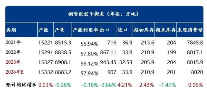 2023年全國鋼管需求呈現一定小幅下降,主要是受到地產拖累以及內需表現不及預期,鋼鐵行業整體受到一定影響。根據Mysteel預測,2024年預計焊管表觀消費量約為5802萬噸,無縫鋼管表觀消費約為2485萬噸,合計表觀消費約為8020萬噸,同比基本持平。但鋼結構、設備更新、管網改造等領域用管需求或有亮點,其中2024年地下管網新增與更新或能帶動鋼管需求量約為259.49-285.62萬噸,同比增長超過30%,其中地下管網更新與改造占比鋼管總需求的3.23%-3.56%。