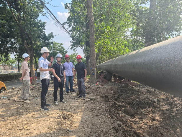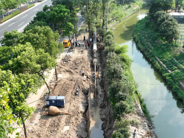 8月3日下午3時許,在七一河路與江南大道交匯處,本次工程的輸水管道最后一個焊接點焊接完畢后,施工人員隨即開始拖管牽引過靈江作業。在靈江北岸一臺大型鋪管鉆機的牽引下,輸水管道以預定的速度被拖進靈江南岸預先擴好的導向孔內,橫穿靈江底部,由靈江北岸拉出。在當日進行的穿越靈江段供水管線工程中,被牽引的輸水管道全長1140米,直徑1米。