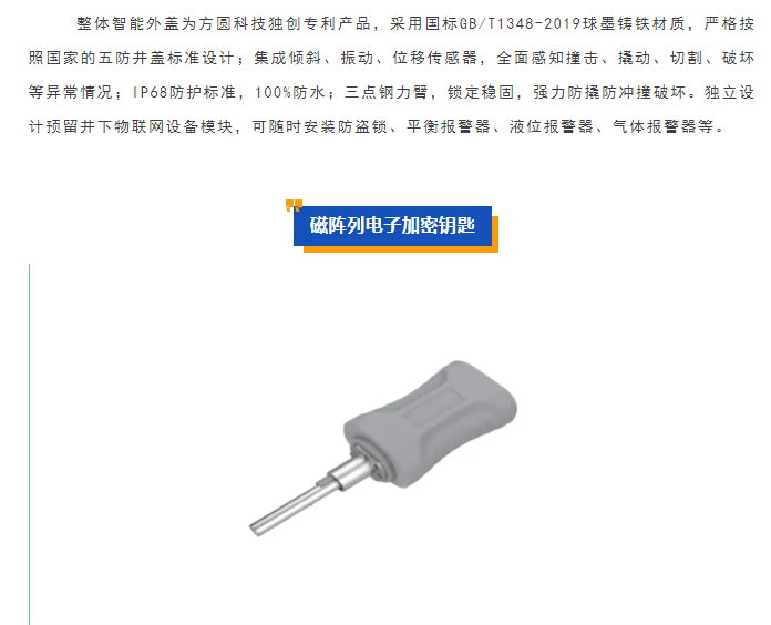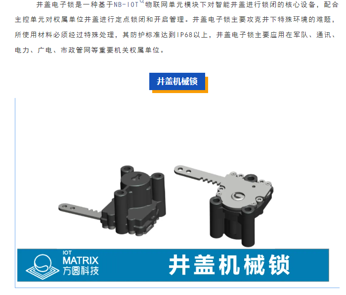 井蓋機械鎖是采用磁陣列加密技術結合純機械結構巧妙設計而成,主要作用是與井蓋電子鎖組合使用,當井蓋電子鎖異常無法正常開啟時,可以啟用井蓋機械鎖進行應急鎖閉開啟。作為臨時應急開鎖裝置,針對戶外井蓋無需實時檢測的環境可作為獨立鎖閉單獨使用。井蓋機械鎖的應急鑰匙采用磁陣列加密算法,并且可以設定多種應急鑰匙滿足各項目的需求;關鍵要害臨時授權可以起到獨一無二的安全成效,解決目前井蓋鎖閉的系列綜合難題。